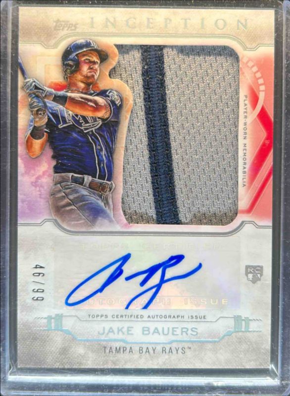 The Jake Bauers 2019 Topps Inception #IAJ-JB Autographs Jumbo Patch /125 Rookie card is 1 of 38 Jake Bauers' card variations in the 2019 Topps Inception set being tracked by Sports Card Investor, including Base, Green, Purple /150, Magenta /99, and Red /75.