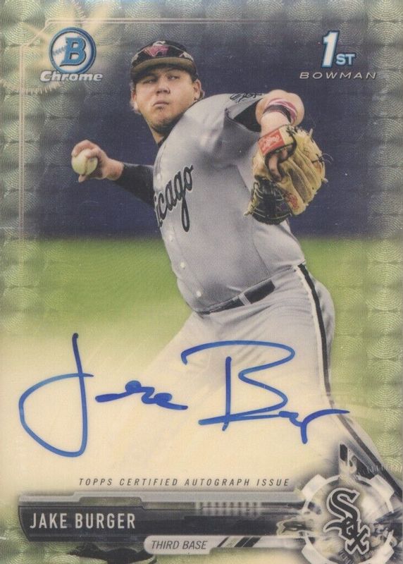 This card is 1 of 15 Jake Burger's card variations in the 2017 Bowman Draft set being tracked by Sports Card Investor, including Chrome DP Auto (1st), Chrome DP Auto - Refractor /499 (1st), Chrome DP Auto - Purple Refractor /250 (1st), Chrome DP Auto - Blue Refractor /150 (1st), and Chrome DP Auto - Blue Wave Refractor /150 (1st).
