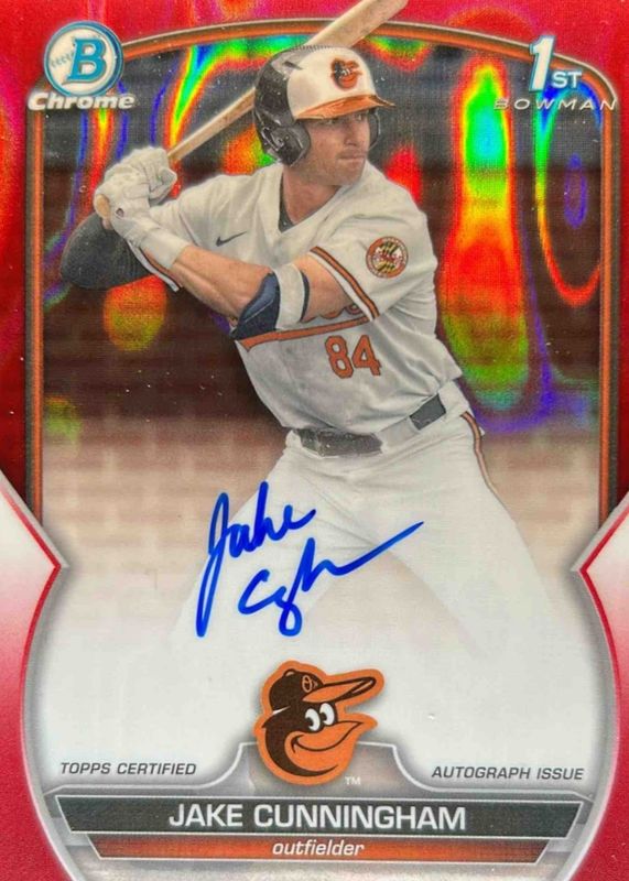 Auctions Ending Soon for Jake Cunningham 2023 Bowman Draft #CDA-JCU Chrome DP Auto - Red Lava Refractor /5 (1st) RAW