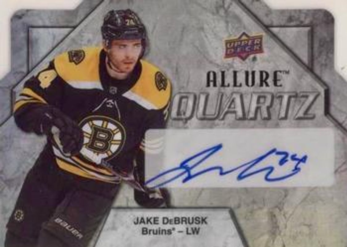The Jake DeBrusk 2019 Upper Deck Allure #AQ-DE Quartz Autographs card is 1 of 2 Jake DeBrusk's card variations in the 2019 Upper Deck Allure set being tracked by Sports Card Investor, including Quartz Autographs Blue /5.