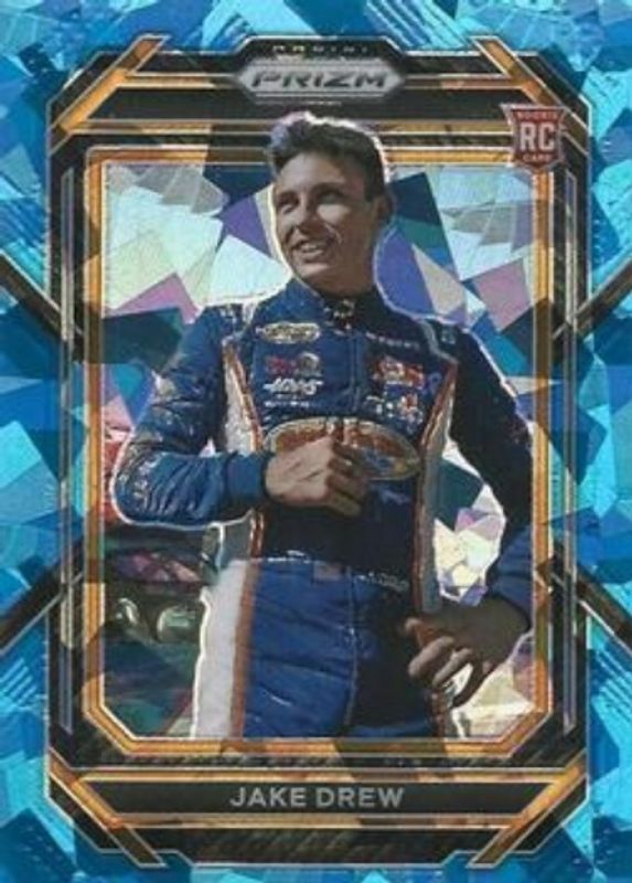 The Jake Drew 2023 Prizm NASCAR #43 Carolina Blue Cracked Ice /25 Rookie card is 1 of 39 Jake Drew's card variations in the 2023 Prizm NASCAR set being tracked by Sports Card Investor, including Base, Hyper Blue & Carolina Blue, Hyper Purple & Yellow, Reactive Orange, and Red.