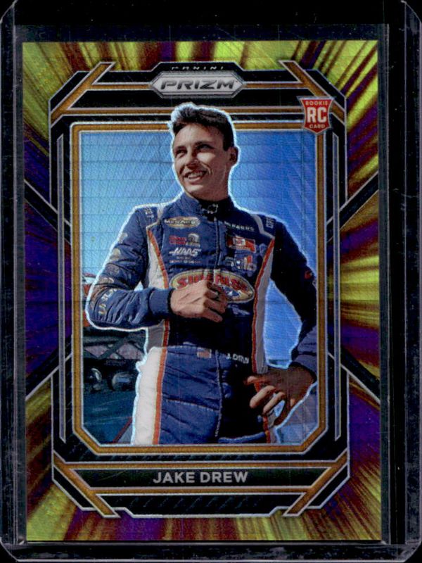 The Jake Drew 2023 Prizm NASCAR #43 Hyper Purple & Yellow Rookie card is 1 of 39 Jake Drew's card variations in the 2023 Prizm NASCAR set being tracked by Sports Card Investor, including Base, Hyper Blue & Carolina Blue, Reactive Orange, Red, and Silver.