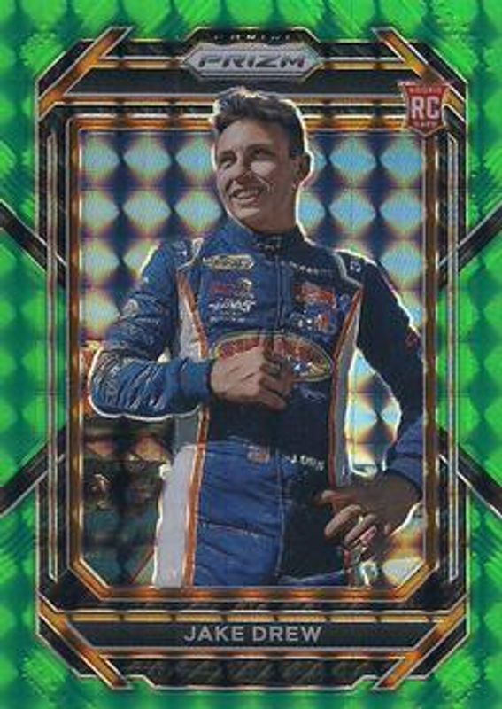 The Jake Drew 2023 Prizm NASCAR #43 Reactive Green /249 Rookie card is 1 of 39 Jake Drew's card variations in the 2023 Prizm NASCAR set being tracked by Sports Card Investor, including Base, Hyper Blue & Carolina Blue, Hyper Purple & Yellow, Reactive Orange, and Red.