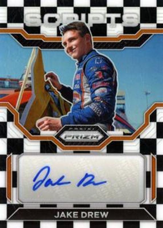 The Jake Drew 2023 Prizm NASCAR #S-JDW Scripts - Checkered Flag /50 Rookie card is 1 of 39 Jake Drew's card variations in the 2023 Prizm NASCAR set being tracked by Sports Card Investor, including Base, Hyper Blue & Carolina Blue, Hyper Purple & Yellow, Reactive Orange, and Red.
