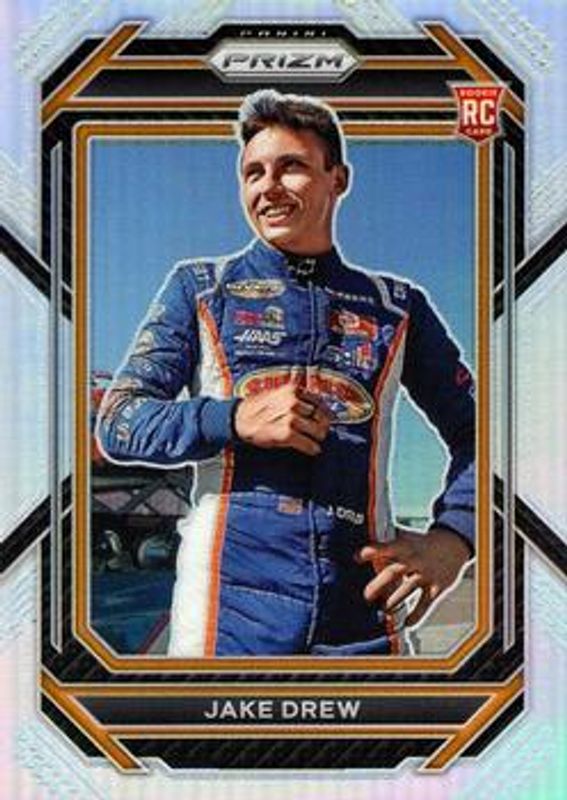 The Jake Drew 2023 Prizm NASCAR #43 Silver Rookie card is 1 of 39 Jake Drew's card variations in the 2023 Prizm NASCAR set being tracked by Sports Card Investor, including Base, Hyper Blue & Carolina Blue, Hyper Purple & Yellow, Reactive Orange, and Red.
