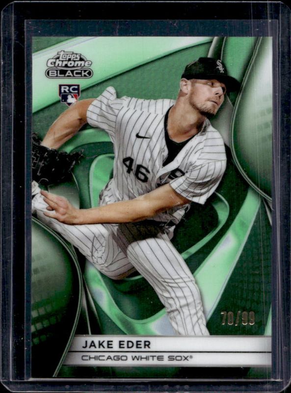 The Jake Eder 2025 Topps Chrome Black #77 Green Refractor /99 Rookie card is 1 of 17 Jake Eder's card variations in the 2025 Topps Chrome Black set being tracked by Sports Card Investor, including Base, Refractor /199, Blue Lava Refractor /150, Blue Refractor /150, and Green Wave Refractor /99.