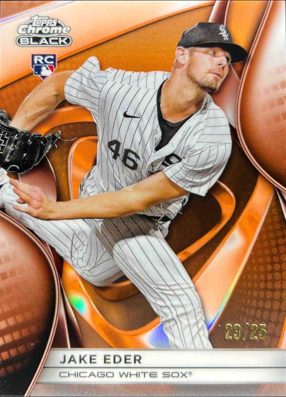 The Jake Eder 2025 Topps Chrome Black #77 Orange Refractor /25 Rookie card is 1 of 17 Jake Eder's card variations in the 2025 Topps Chrome Black set being tracked by Sports Card Investor, including Base, Refractor /199, Blue Lava Refractor /150, Blue Refractor /150, and Green Refractor /99.