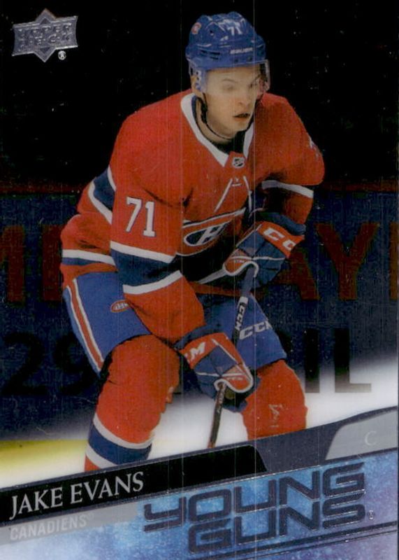 Jake Evans' Hockey cards are available in at least 28 sets. Jake Evans' biggest 7-day price movers are 2020 Upper Deck #247 Young Guns Base, 2020 Upper Deck #247 Young Guns - Clear Cut, and 2020 Metal Universe #PP-11 Skybox Premium Prospects 1997 Retro Star Rubies Autographs.