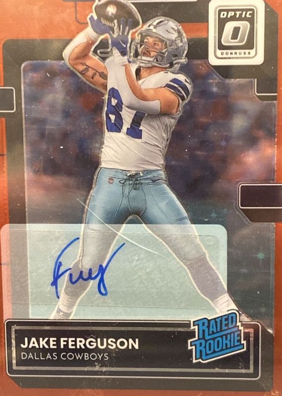 This card is 1 of 13 Jake Ferguson's card variations in the 2022 Optic set being tracked by Sports Card Investor, including Rated Rookie Autographs - Purple Stars (/10), Rated Rookie Autographs /150, Rated Rookie Autographs - Holo /125, Rated Rookie Autographs - Blue /99, and Rated Rookie Autographs - Red /75.