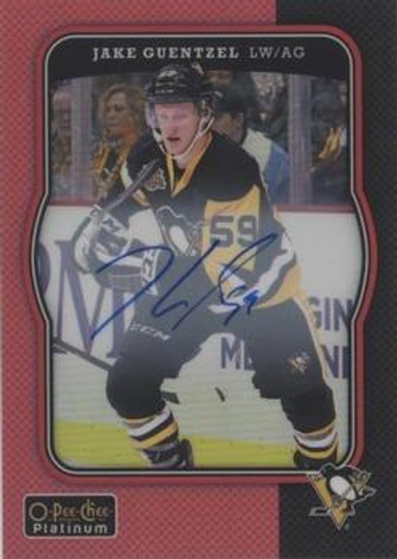 The Jake Guentzel 2017 O-Pee-Chee Platinum #R-10 Retro Red Rainbow Autographs card is 1 of 26 Jake Guentzel's card variations in the 2017 O-Pee-Chee Platinum set being tracked by Sports Card Investor, including Base, Rainbow, Violet Pixels, Red Prism /199, and Royal Blue Cubes /99.