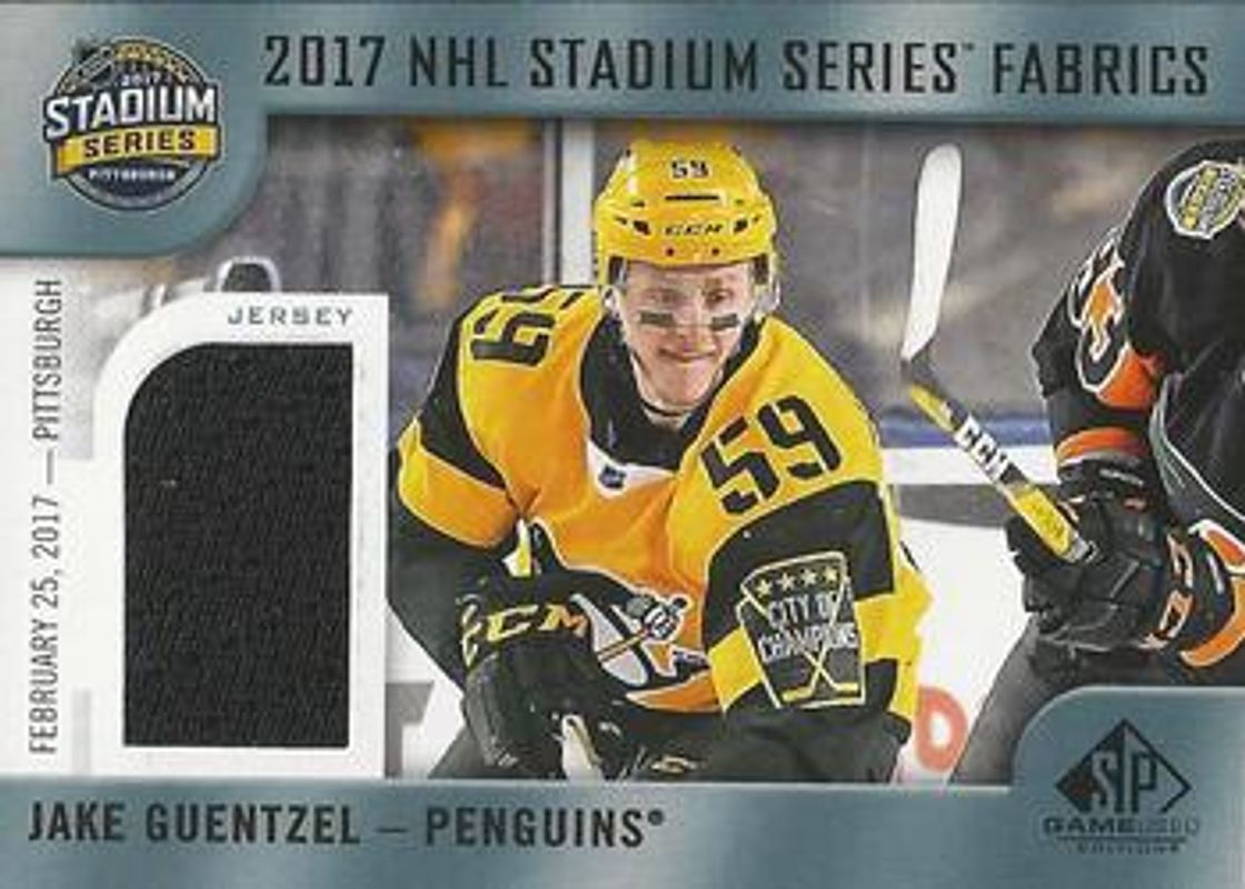 The Jake Guentzel 2017 SP Game Used #PP-JG 2017 NHL Stadium Series Fabrics card is 1 of 19 Jake Guentzel's card variations in the 2017 SP Game Used set being tracked by Sports Card Investor, including Base /73, Blue Autographs, Gold Jerseys /399, Orange Rainbow /113, and Autographs /92.