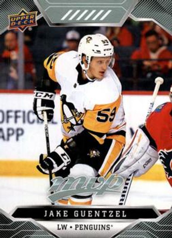 The Jake Guentzel 2019 Upper Deck MVP #66 Base card is 1 of 17 Jake Guentzel's card variations in the 2019 Upper Deck MVP set being tracked by Sports Card Investor, including Blue, Gold Script, Puzzle Backs, Silver Script, and Super Script /25.