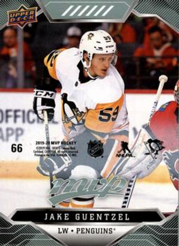 The Jake Guentzel 2019 Upper Deck MVP #66 Puzzle Backs card is 1 of 17 Jake Guentzel's card variations in the 2019 Upper Deck MVP set being tracked by Sports Card Investor, including Base, Blue, Gold Script, Silver Script, and Super Script /25.