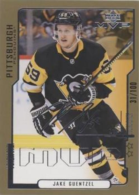 The Jake Guentzel 2020 Upper Deck MVP #92 20th Anniversary Second Star /100 card is 1 of 18 Jake Guentzel's card variations in the 2020 Upper Deck MVP set being tracked by Sports Card Investor, including Base, Blue, Gold Script, Puzzle Backs, and Silver Script.