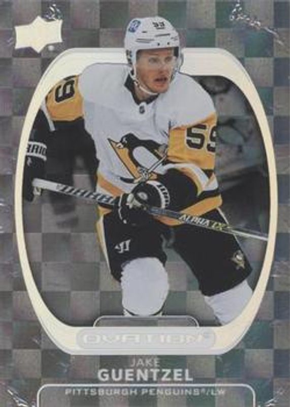 The Jake Guentzel 2021 Upper Deck Ovation #20 Checkerboard card is 1 of 20 Jake Guentzel's card variations in the 2021 Upper Deck Ovation set being tracked by Sports Card Investor, including Base, Gold Circular Wonder, Gold Foil, Silver Foil, and Standing Ovation /500.