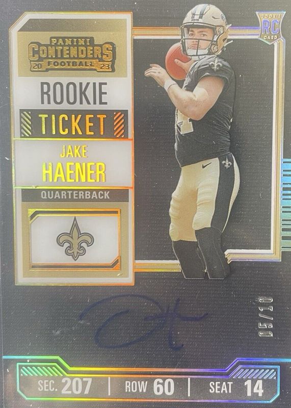 This card is 1 of 26 Jake Haener's card variations in the 2023 Contenders set being tracked by Sports Card Investor, including Rookie Ticket Auto, Rookie Ticket Auto - Opening Kickoff Ticket, Rookie Ticket Auto - Red Zone Ticket, Rookie Ticket Auto - Ticket Stub (/3), and Rookie Ticket Auto Variation.