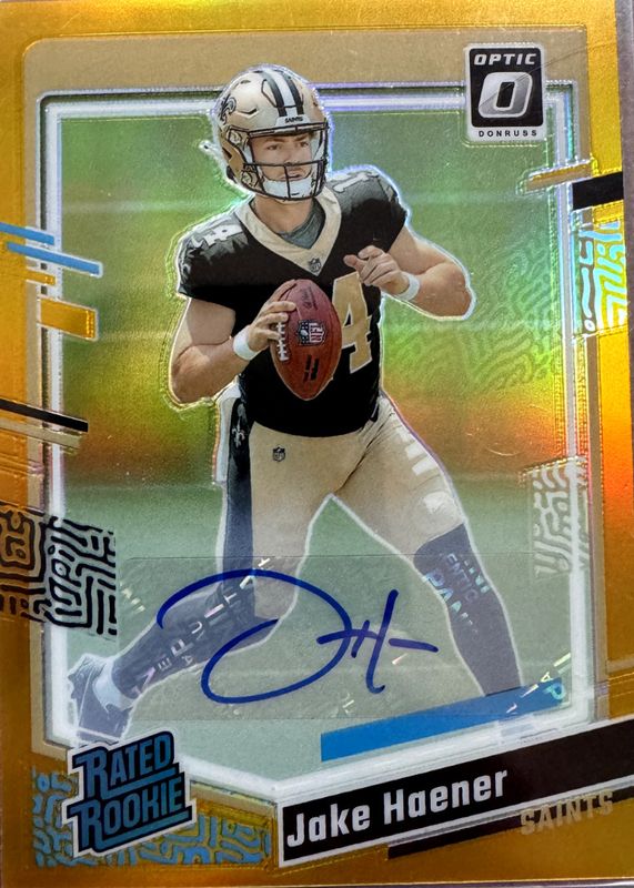 2023 Donruss Optic Jake Haener RC Rated Rookie Auto Gold /10 Saints FTDX