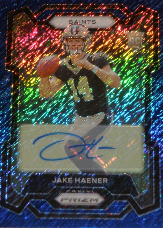The Jake Haener 2023 Prizm #374 Rookie Autographs - Blue Shimmer /25 card in Raw condition has not changed in price in the last 30 days and was last sold for $99.99 .