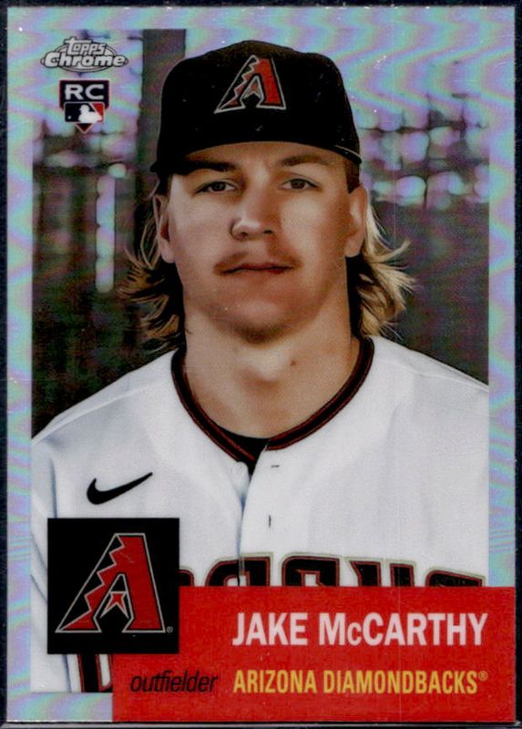 The Jake McCarthy 2022 Topps Chrome Platinum Anniversary #351 Refractor Rookie card is 1 of 34 Jake McCarthy's card variations in the 2022 Topps Chrome Platinum Anniversary set being tracked by Sports Card Investor, including Base, Black & White Mini Diamond Refractor, Blue Prism Refractor, Gold Prism Refractor, and Prism Refractor.