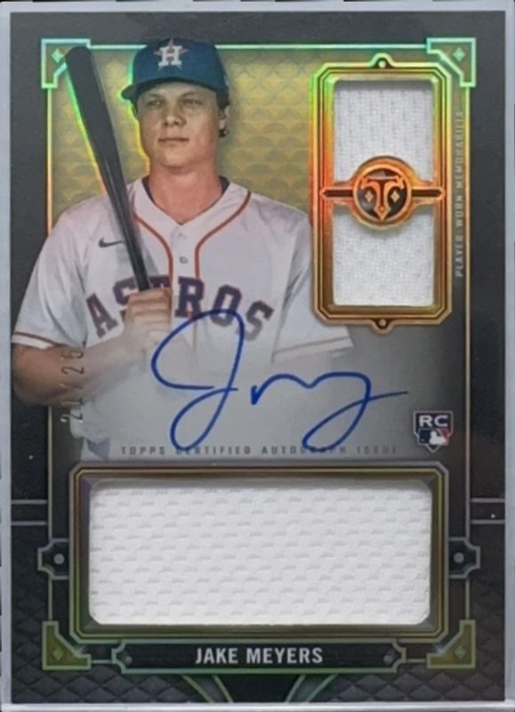 The Jake Meyers 2022 Topps Triple Threads #RFPAR-JM Rookie & Future Phenoms Autographs Relics - Onyx /25 card is 1 of 18 Jake Meyers' card variations in the 2022 Topps Triple Threads set being tracked by Sports Card Investor, including Autographs Single Jumbo Relics /99, Rookie & Future Phenoms Autographs Relics /99, Autographs Single Jumbo Relics - Amethyst /75, Rookie & Future Phenoms Autographs Relics - Amethyst /75, and Autographs Single Jumbo Relics - Emerald /50.