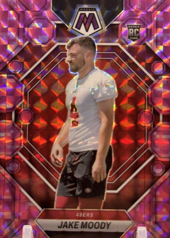The Jake Moody 2023 Mosaic #326 Pink Camo Rookie card in Raw condition has not changed in price in the last 30 days and was last sold for $1.89 .