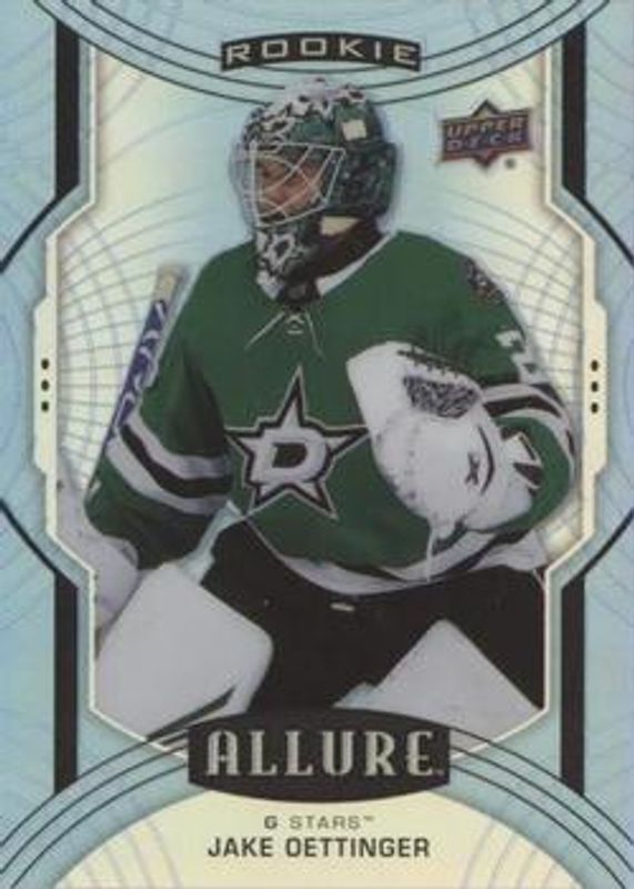 The Jake Oettinger 2020 Upper Deck Allure #133 Double Rainbow Rookie card is 1 of 57 Jake Oettinger's card variations in the 2020 Upper Deck Allure set being tracked by Sports Card Investor, including #91 Base, #133 Base, #91 2005 Shield, #91 Black Rainbow, and #91 Blue China.