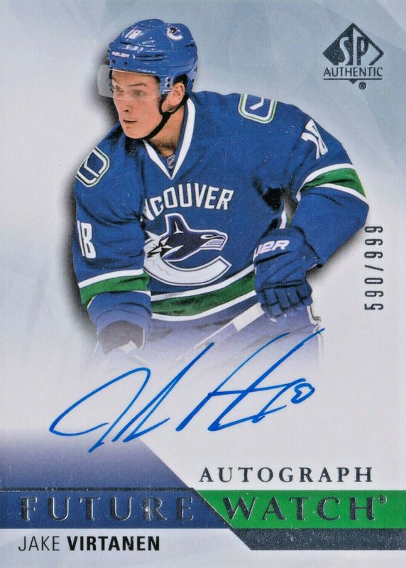 Jake Virtanen's Hockey cards are available in at least 48 sets. Jake Virtanen's biggest 7-day price movers are 2015 SP Authentic #277 Future Watch Auto /999, 2015 Upper Deck #457 Young Guns - UD Exclusives /100, and 2015 Upper Deck #457 Young Guns - UD High Gloss /10.