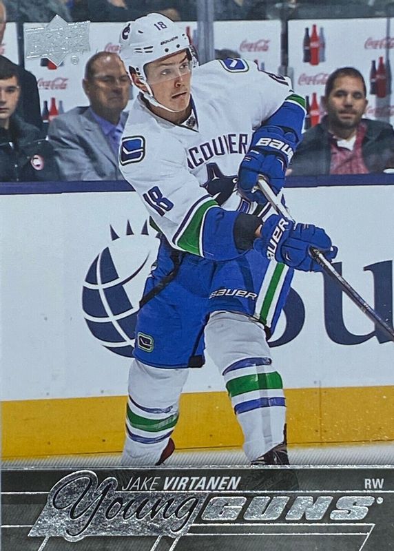 This card is 1 of 7 Jake Virtanen's card variations in the 2015 Upper Deck set being tracked by Sports Card Investor, including Young Guns - Jumbo, Young Guns - Acetate, Young Guns - Foil, Young Guns - UD Exclusives /100, and Young Guns - UD Midnight /25.