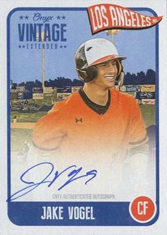The Jake Vogel 2020 Onyx Vintage Extended #EAJV Autographs - Blue card is 1 of 5 Jake Vogel's card variations in the 2020 Onyx Vintage Extended set being tracked by Sports Card Investor, including Base, Autographs - Green, Autographs - Red, and Autographs - Black /5.