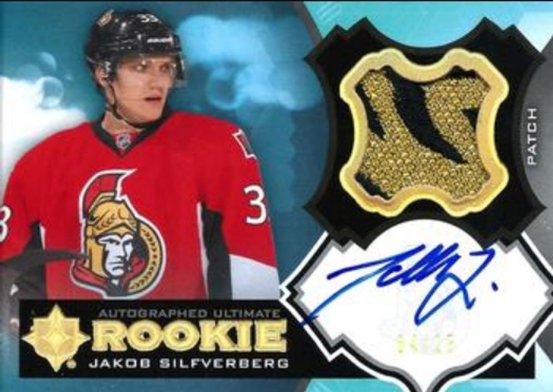 The Jakob Silfverberg 2012 Upper Deck The Cup #40 2012 Upper Deck Ultimate Collection: Autographed Ultimate Rookies Patch /25 card is 1 of 65 Jakob Silfverberg's card variations in the 2012 Upper Deck The Cup set being tracked by Sports Card Investor, including Base /249, Gold /25, Gold Rainbow /10, Black /1, and Black Laundry Tags /1.