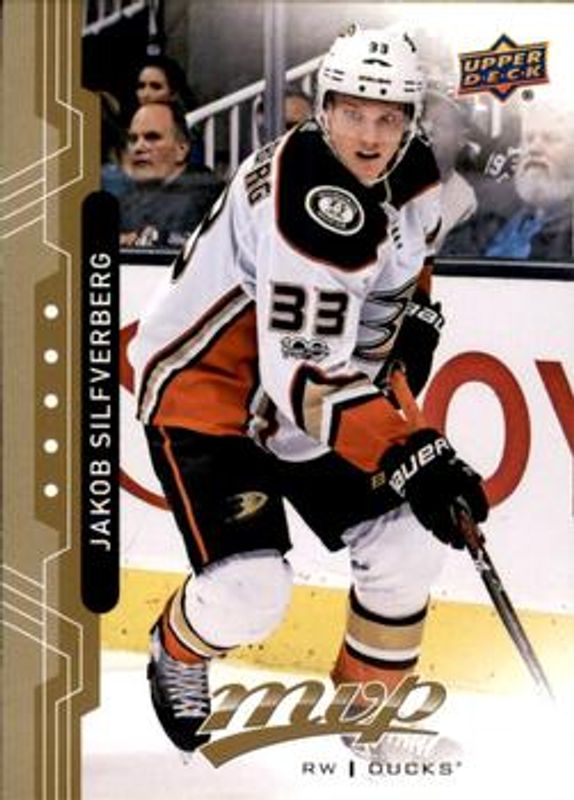 The Jakob Silfverberg 2018 Upper Deck MVP #54 Base card is 1 of 11 Jakob Silfverberg's card variations in the 2018 Upper Deck MVP set being tracked by Sports Card Investor, including Factory Set Blue, Green Script, Puzzle Back, Silver Script, and Gold Script /150.