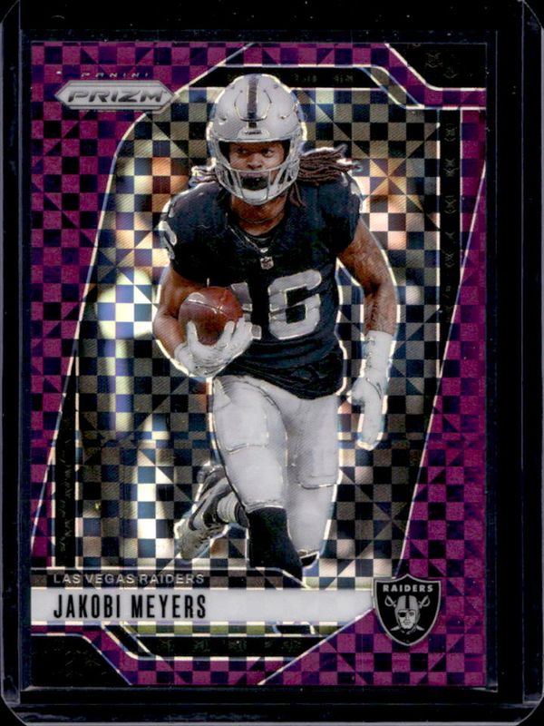 The Jakobi Meyers 2024 Prizm #151 Purple Power /49 card is 1 of 84 Jakobi Meyers' card variations in the 2024 Prizm set being tracked by Sports Card Investor, including Base, Choice Blue Yellow Green, Choice Silver, Disco, and Green.