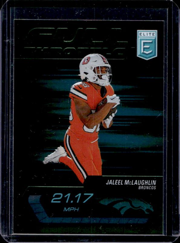 The Jaleel McLaughlin 2024 Elite #21 Full Throttle - Green card is 1 of 9 Jaleel McLaughlin's card variations in the 2024 Elite set being tracked by Sports Card Investor, including Full Throttle - Pink, Full Throttle /349, Full Throttle - Orange /99, Full Throttle - Red /75, and Full Throttle - Blue /25.