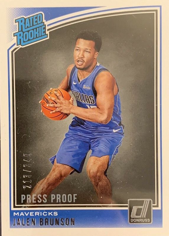 The Jalen Brunson 2018 Donruss #179 Press Proof Silver /349 Rookie card in Raw condition has moved up $12.00 (+42.9%) in the last 30 days and was last sold for $40.00 .