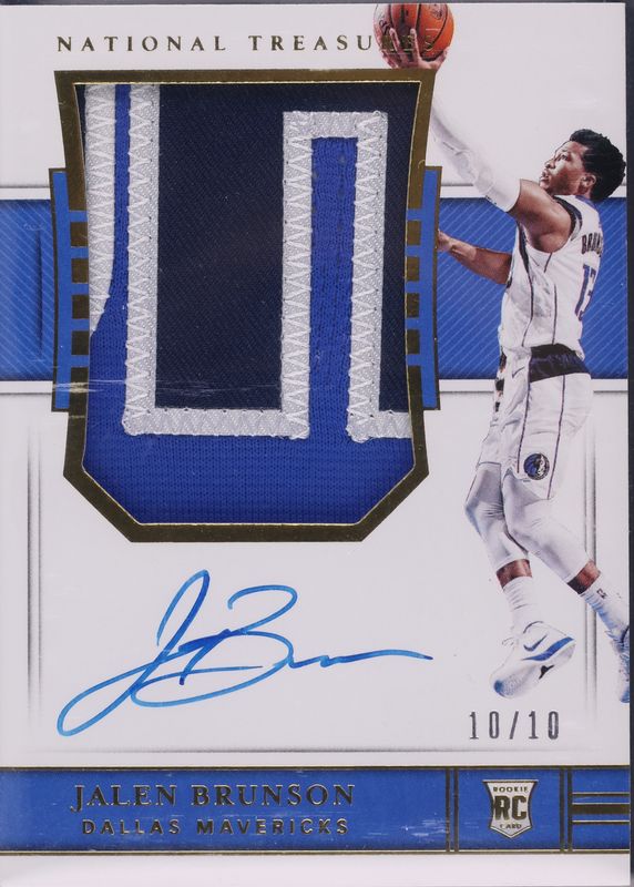 This card is 1 of 8 Jalen Brunson's card variations in the 2018 National Treasures set being tracked by Sports Card Investor, including Rookie Patch Auto /99, Rookie Patch Auto - FOTL /20, Rookie Patch Auto - Emerald /5, Rookie Patch Auto - Blue FOTL /3, and Rookie Patch Auto - Logoman /1.