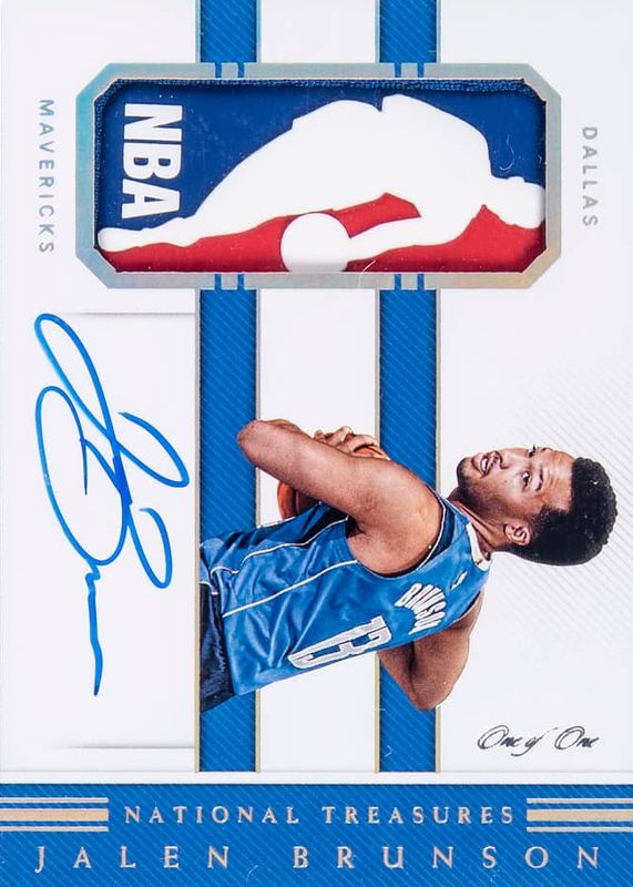 This card is 1 of 8 Jalen Brunson's card variations in the 2018 National Treasures set being tracked by Sports Card Investor, including Rookie Patch Auto /99, Rookie Patch Auto - FOTL /20, Rookie Patch Auto - Gold /10, Rookie Patch Auto - Emerald /5, and Rookie Patch Auto - Blue FOTL /3.