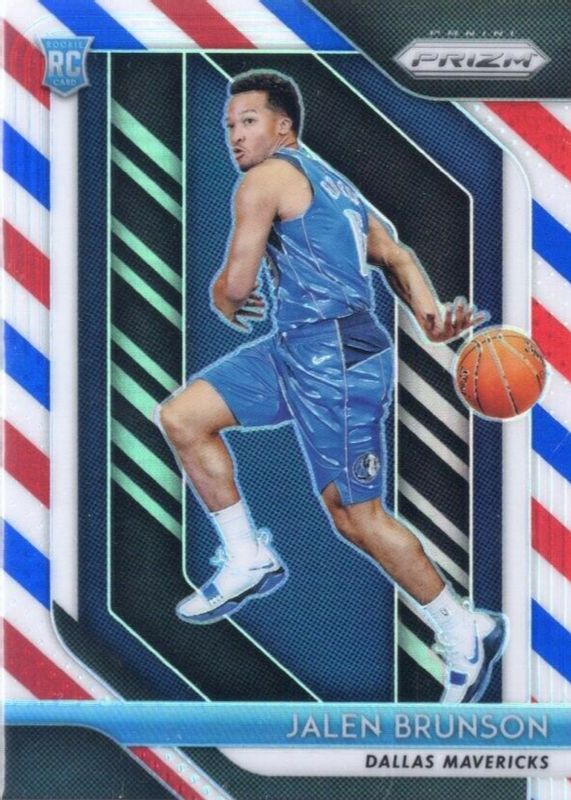 The Jalen Brunson 2018 Prizm #250 Red White Blue Rookie card in Raw condition has moved up $15.62 (+137%) in the last 30 days and was last sold for $27.00 .