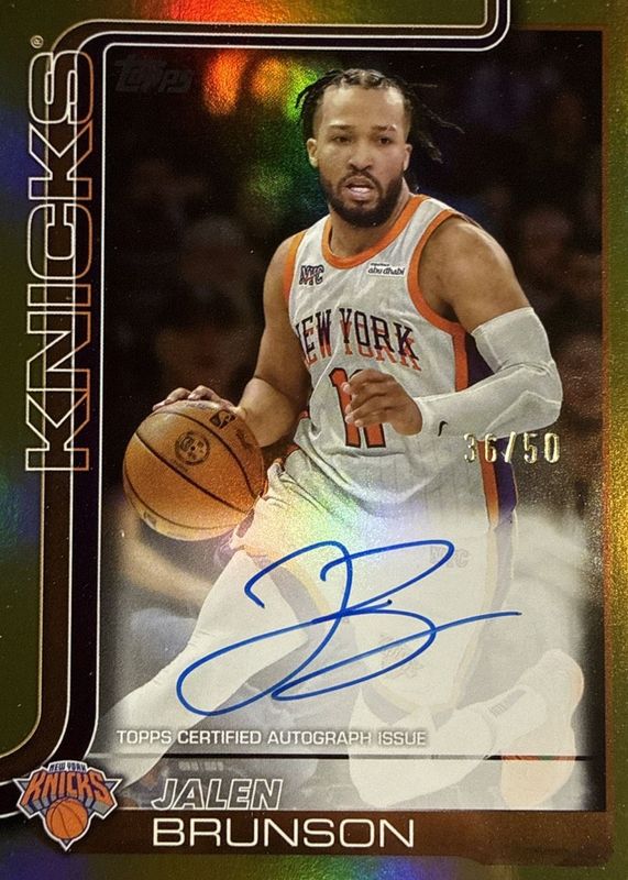 The Jalen Brunson 2025 Topps #TFRA-JB Flagship Real One Autographs - Gold Rainbow /50 card in Raw condition has moved up $113 (+60.0%) in the last 30 days and was last sold for $300.00 .