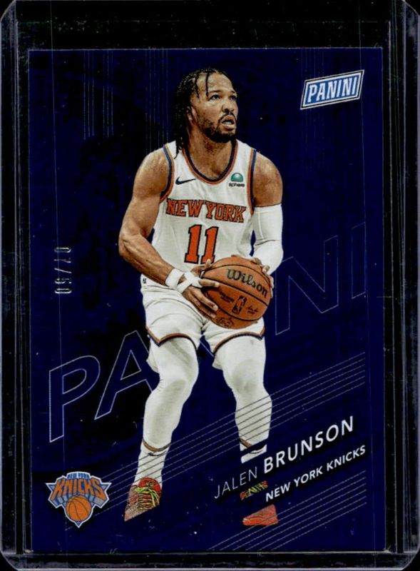 The Jalen Brunson 2024 Panini NSCC Wrapper Redemption #33 Blue /50 card is 1 of 10 Jalen Brunson's card variations in the 2024 Panini NSCC Wrapper Redemption set being tracked by Sports Card Investor, including Base, Foil, Orange /199, Red /99, and Cracked Ice /25.