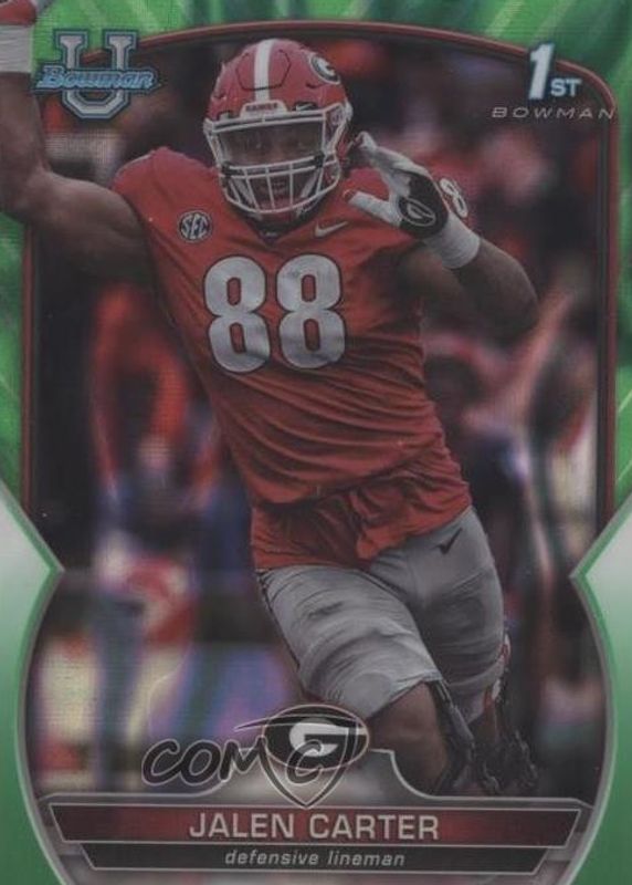The Jalen Carter 2022 Bowman Chrome University #37 Prospects - Green Lava Refractor /99 (1st) card in Raw condition has not changed in price in the last 30 days and was last sold for $2.34 .