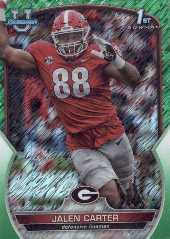 The Jalen Carter 2022 Bowman Chrome University #37 Prospects - Green Shimmer Refractor /99 (1st) card in Raw condition has not changed in price in the last 30 days and was last sold for $3.25 .