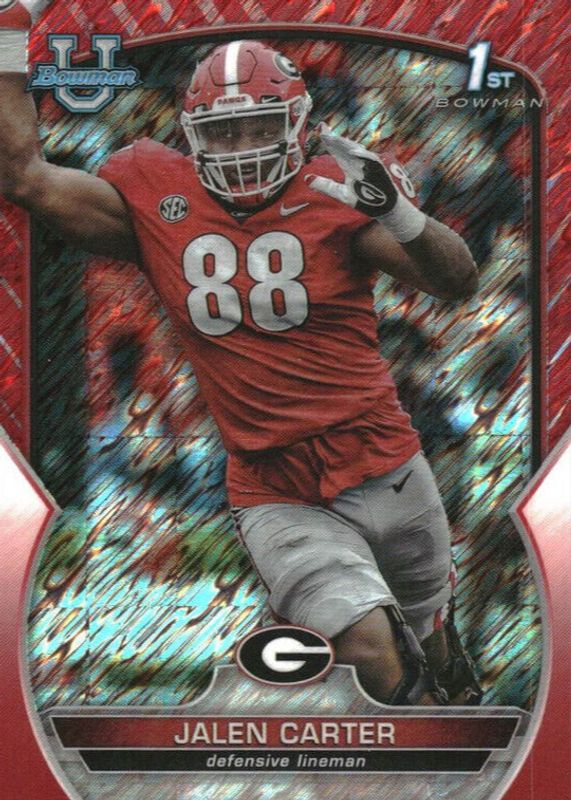 The Jalen Carter 2022 Bowman Chrome University #37 Prospects - Red Shimmer Refractor /10 (1st) card in Raw condition has not changed in price in the last 30 days and was last sold for $89.00 .