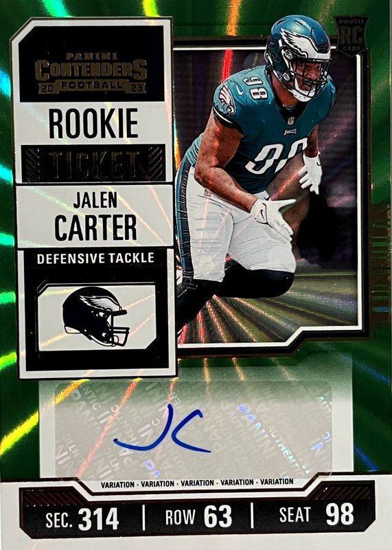 2023 Panini Contenders Rookie Ticket - Jalen Carter Auto Green Laser #114 Eagles
