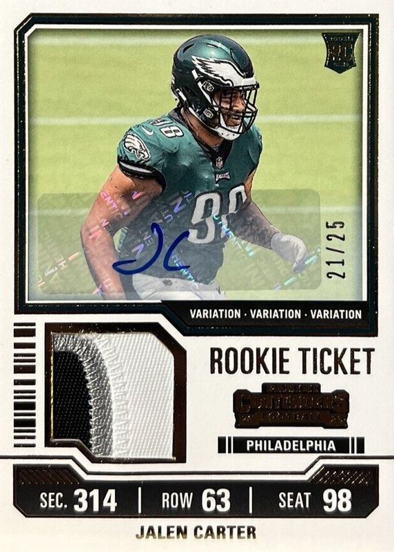 This card is 1 of 30 Jalen Carter's card variations in the 2023 Contenders set being tracked by Sports Card Investor, including Rookie Ticket Auto, Rookie Ticket Auto - Opening Kickoff Ticket, Rookie Ticket Auto - Red Zone Ticket, Rookie Ticket Auto - Ticket Stub (/98), and Rookie Ticket Auto Variation.