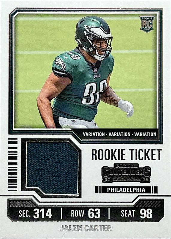 The Jalen Carter 2023 Contenders #TS14V Rookie Ticket Swatches Variation card in Raw condition has moved up $1.50 (+152%) in the last 30 days and was last sold for $2.49 .