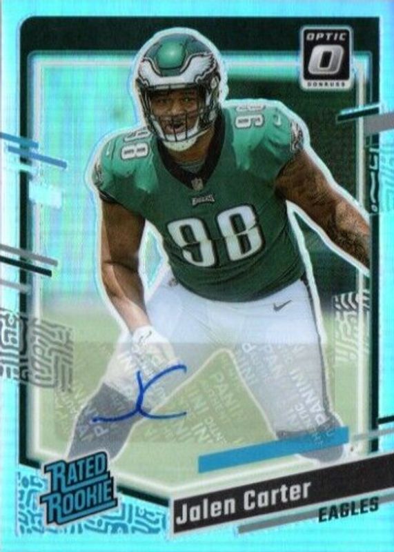 The Jalen Carter 2023 Donruss #381 Optic Rated Rookie Preview Autographs card in Raw condition has not changed in price in the last 30 days and was last sold for $27.00 .