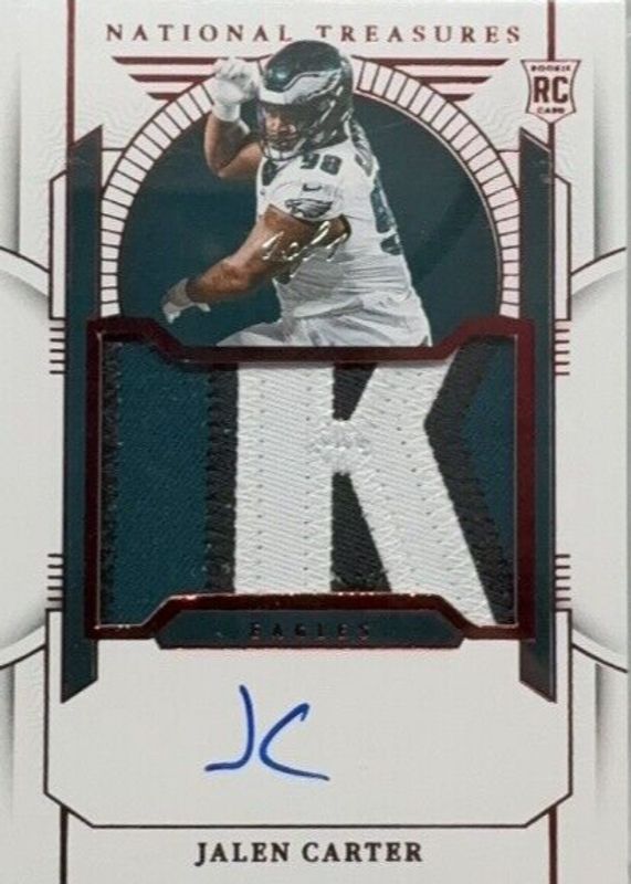 The Jalen Carter 2023 National Treasures #169 Rookie Patch Auto - Red /1 card in Raw condition has not changed in price in the last 30 days and was last sold for $787.00 .