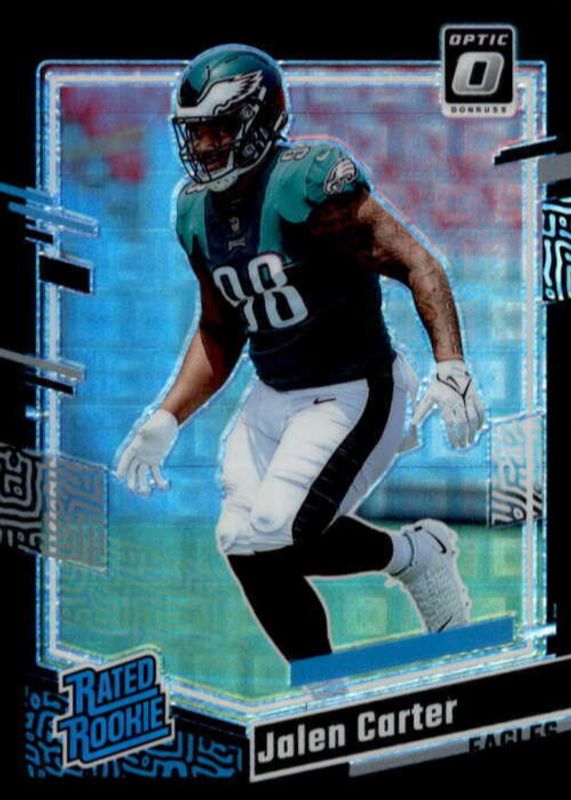 This card is 1 of 62 Jalen Carter's card variations in the 2023 Optic set being tracked by Sports Card Investor, including Base, Blue Hyper, Blue Scope, Green Hyper, and Green Velocity.