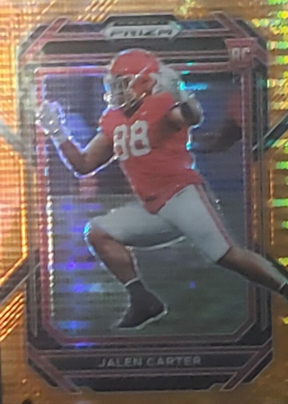 The Jalen Carter 2023 Prizm Draft Picks #163 Orange Pulsar /49 Rookie card in Raw condition has not changed in price in the last 30 days and was last sold for $22.99 .