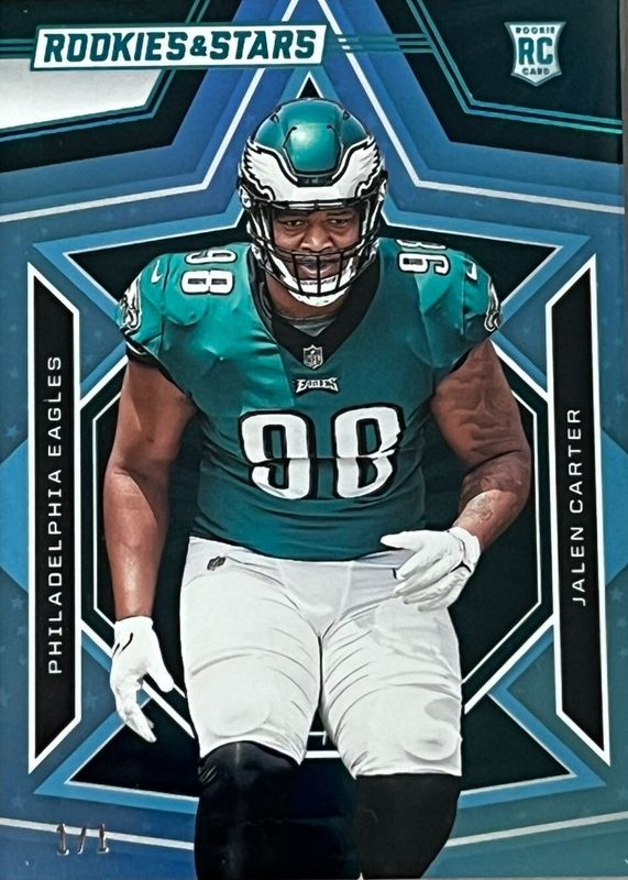 This card is 1 of 24 Jalen Carter's card variations in the 2023 Rookies & Stars set being tracked by Sports Card Investor, including Base, Green, Longevity, Red, and Purple /199.
